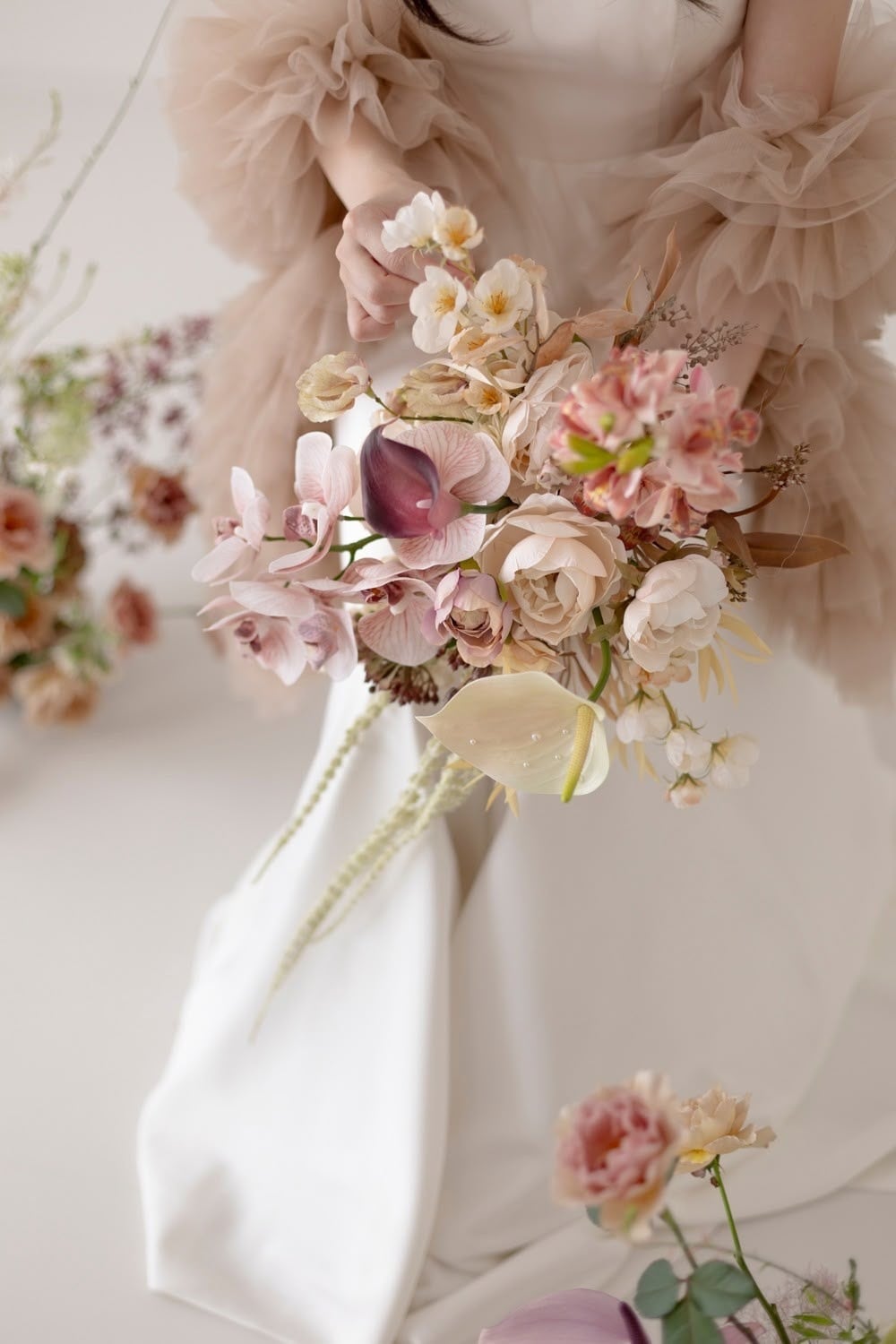 ふわっと柔らかいベージュピンクや深みのあるお花と