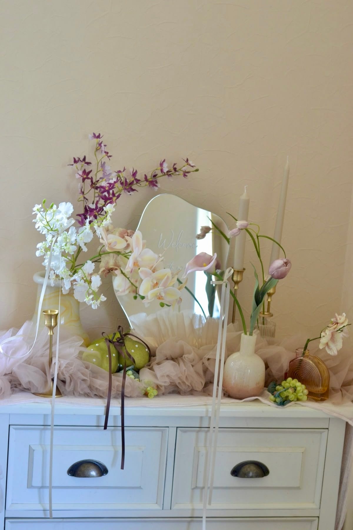 撮影映えもばっちりな、アーティフィシャルフラワーの装飾。