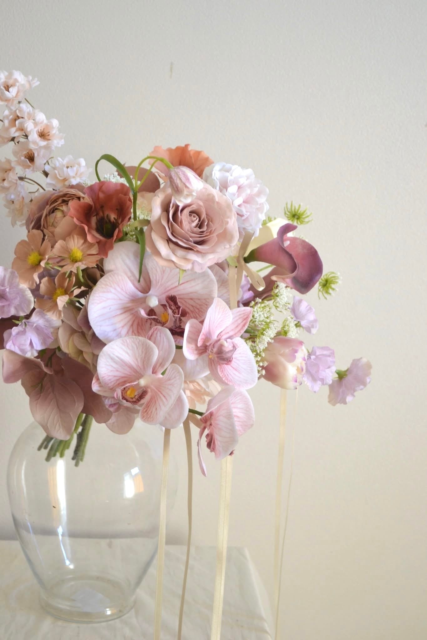 くすみピンクの胡蝶蘭と揺れるリボンのweddingブーケ・ブートニアset