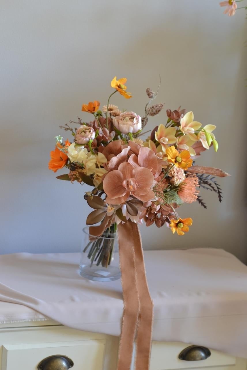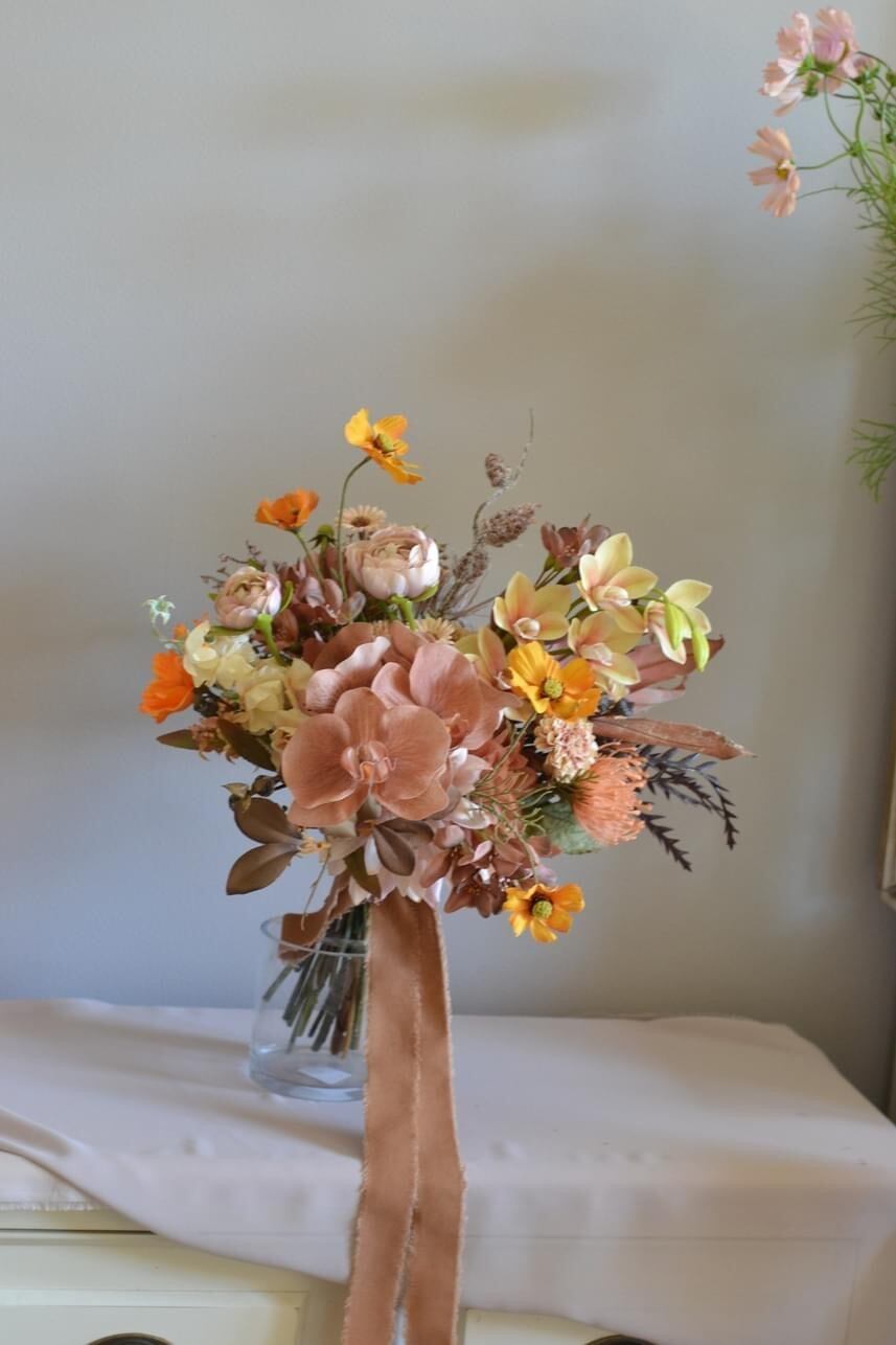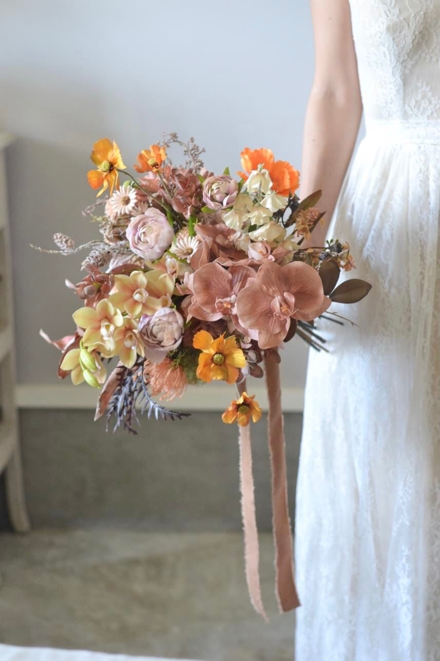 テラコッタオレンジ色のファレノやくすみピンクで大人っぽさと可愛さを感じるデザインのブーケは