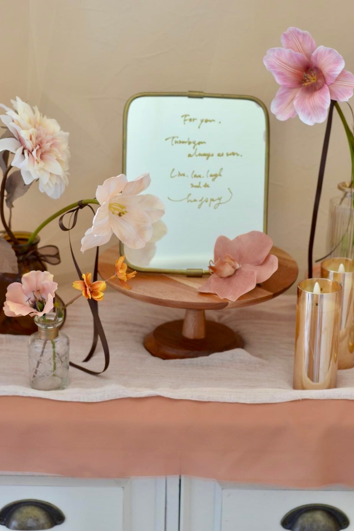 リボンと一緒にフラワーベースに高低差をつけて飾れます)