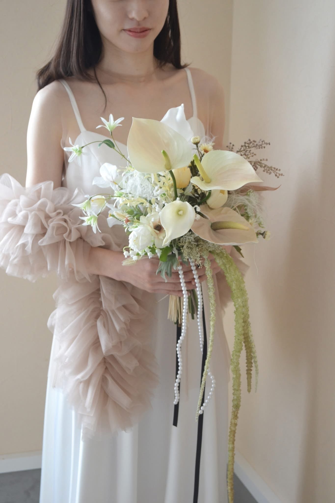 流れるパールやベロアリボンのデザインのブーケは