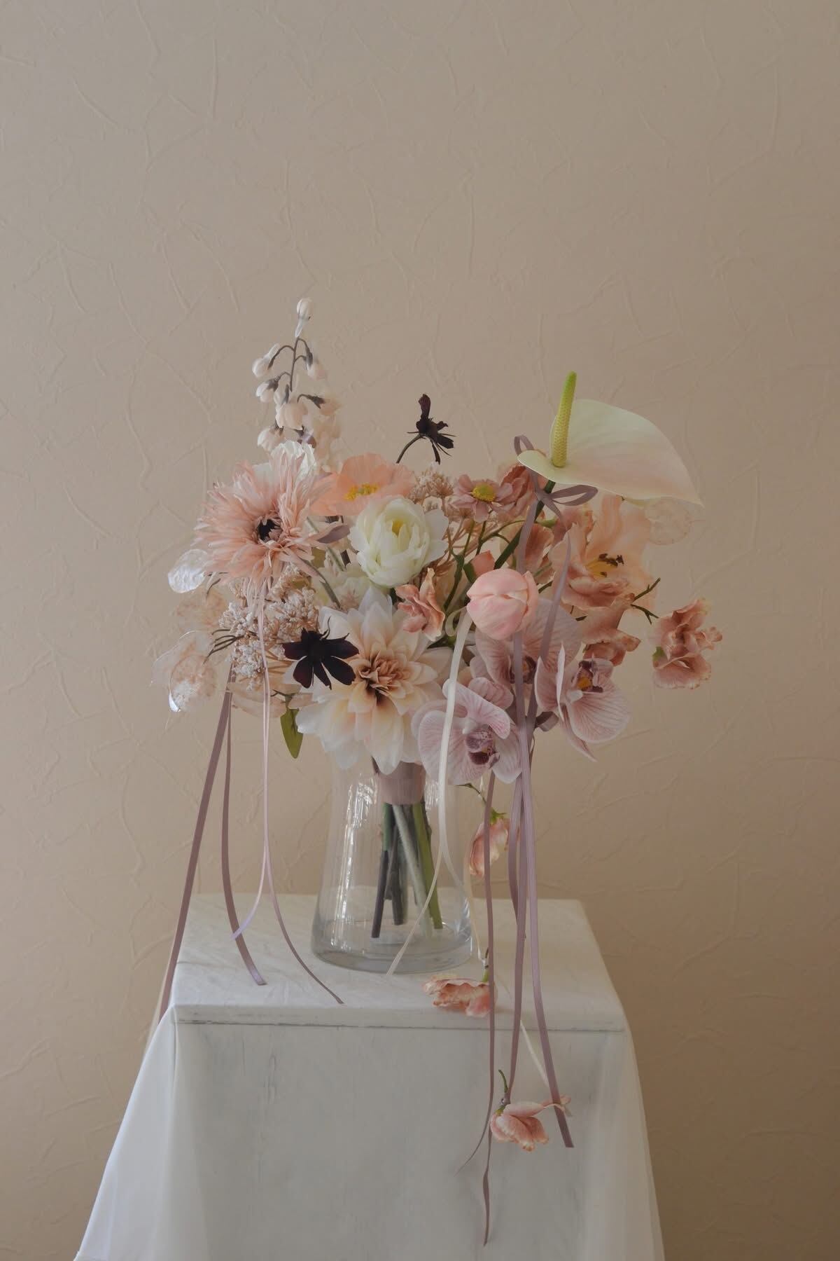 さらりと揺れるリボンを結んだデザインブーケ